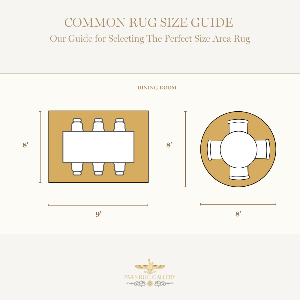 A dining room requires both functional and stylish rugs. Therefore, it should be enough to cover the dining table and chairs. A good thumb rule is to add 24 inches to each side of the dining table.