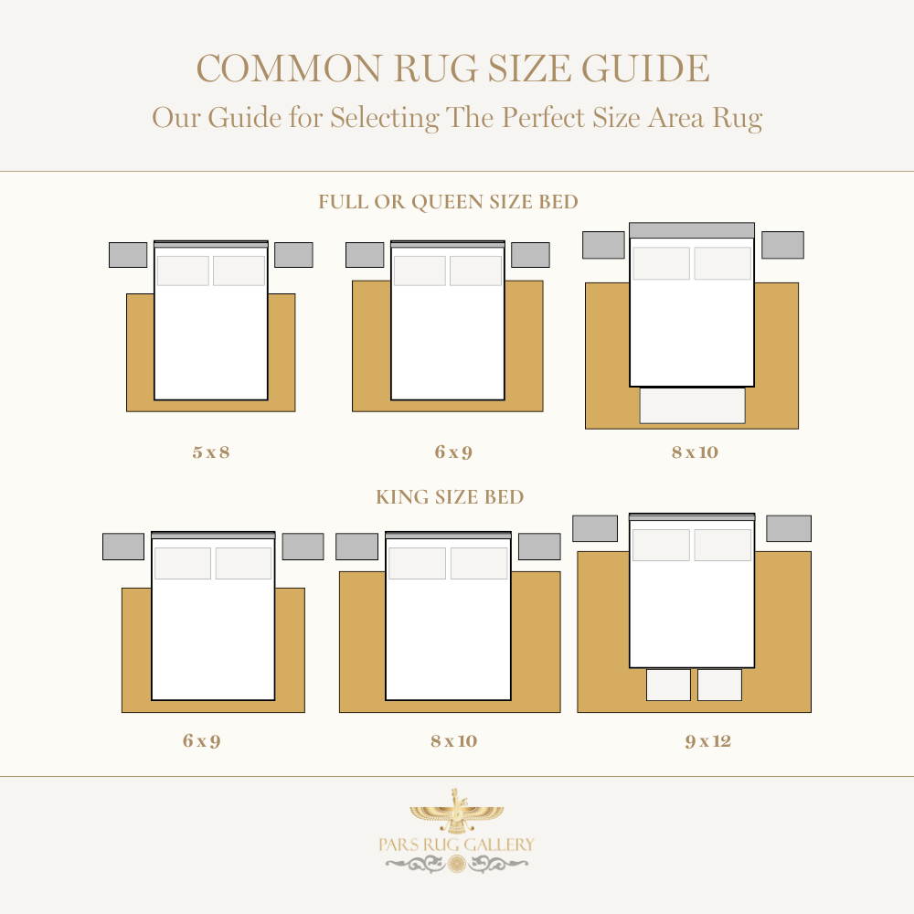 Typically, a bedroom rug should be large enough to extend beyond the bed. An 8’x10’ rug is suitable for a queen-sized bed and a 9’x12’ rug for a king-sized bed.